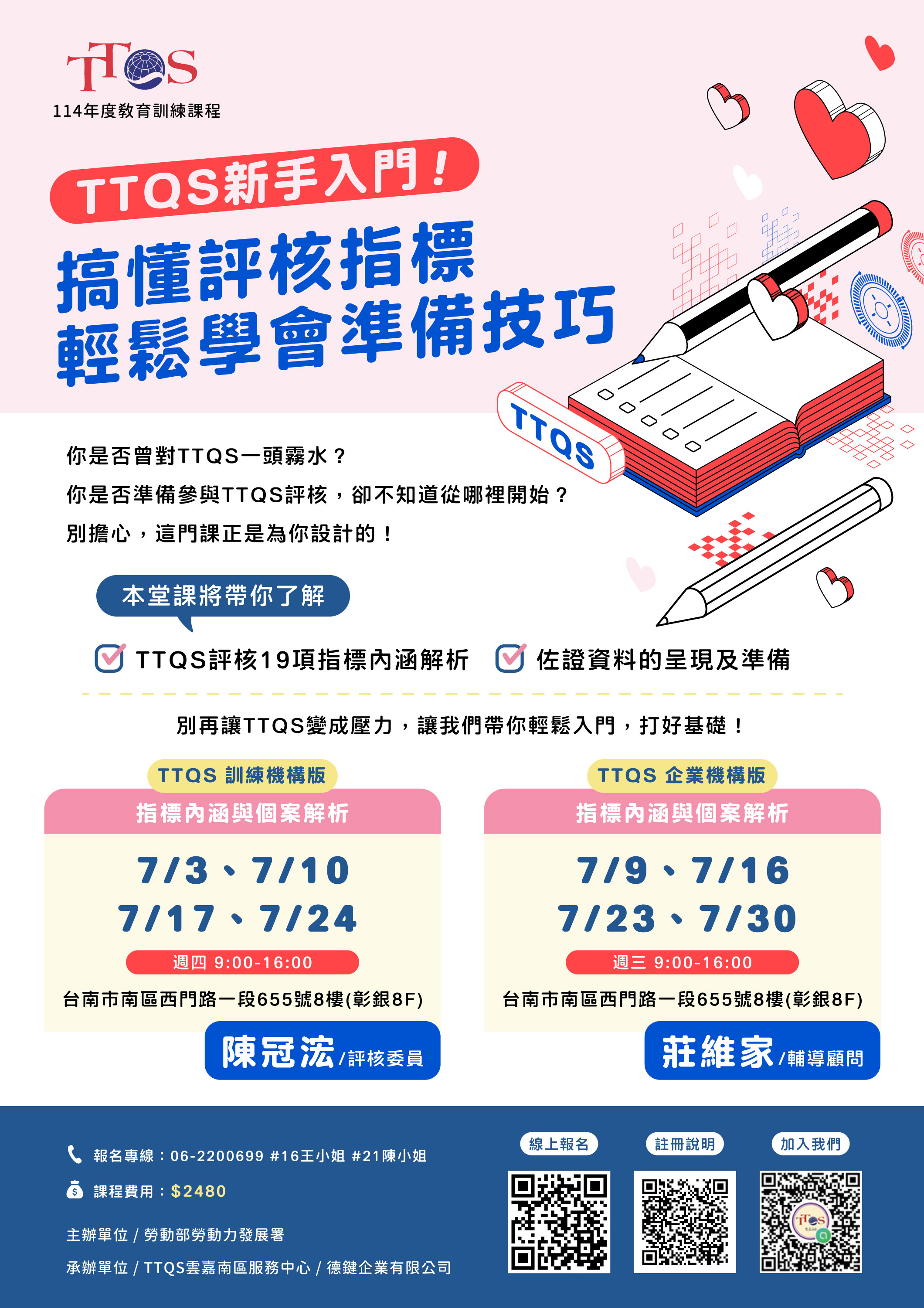 每班課程費用僅2,480元。名額有限,歡迎踴躍報名! 報名連結:https://ttqs.wda.gov.tw/ 區別請選擇”雲嘉南區” _____________________________ TTQS新手入門! 搞懂評核指標,輕鬆學會準備技巧! 本堂課將帶您了解 ★TTQS評核19項指標內涵 ★佐證資料的呈現與準備 【TTQS訓練機構版指標內涵與個案解析】 日期:7/3、7/10、7/17、7/24 (週四 9:00~16:00) 講師:陳冠浤/評核委員 地點:台南市南區西門路一段655號8樓(彰銀8F) 【TTQS企業機構版指標內涵與個案解析】 日期:7/9、7/16、7/23、7/30 (週三 9:00~16:00) 講師:莊維家/輔導顧問 地點:台南市南區西門路一段655號8樓(彰銀8F) |