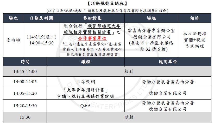 勞動部勞動力發展署雲嘉南分署 114年度大專青年預聘計畫教育訓練暨核銷說明會 勞動部勞動力發展署為因應青年求職困難及市場缺工現象,鼓勵特定重點產業於畢業前一年先行聘僱大專在校青年從事崗位訓練及勞務提供或工作,以協助其畢業即就業,訂定「大專青年預聘計畫」。 為使教育部核定大專校院校外實習相關計畫之合作事業單位充分瞭解上述計畫內容、執行注意事項及核銷作業等,勞動部勞動力發展署雲嘉南分署特辦理計畫說明會,針對114年度計畫內容進行說明,歡迎踴躍報名參加! ◆主辦單位:勞動部勞動力發展署雲嘉南分署 ◆彙管單位:德鍵企業有限公司 ◆報名方式及注意事項 1. 本活動免費,即日起受理報名,敬請即刻報名。 2. 線上報名:點我連結報名 3. 報名截止時間:114/8/14(週四)17:00前截止 4. 報名聯絡窗口:06-2200088 分機27 施小姐 ※報名送出後請來電確認是否報名成功以確保您的權益。 5. 當日會議請各單位參加人員務必準時與會,以免影響貴單位權益。 6. 為響應環保,會場將不提供紙杯,請自行攜帶環保杯。 7. 為確保當日視訊品質及會議流暢,將進行參與人員人次管控,敬邀實際辦理訓練業務人員與會,登入時請務必配合填寫【事業單位名稱-出席者完整中文姓名】。 8. 請以視訊方式與會之事業單位夥伴務必於會議前詳閱視訊操作手冊並請確認設備是否已安裝相關軟體,若有操作問題,可致電專案辦公室(06)2200088分機20~37詢問。 |