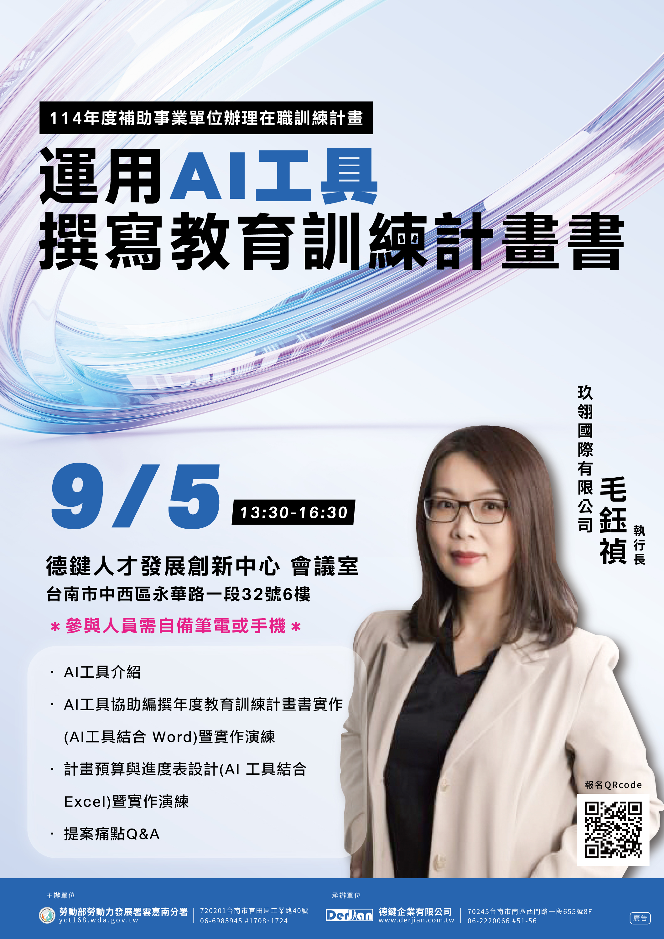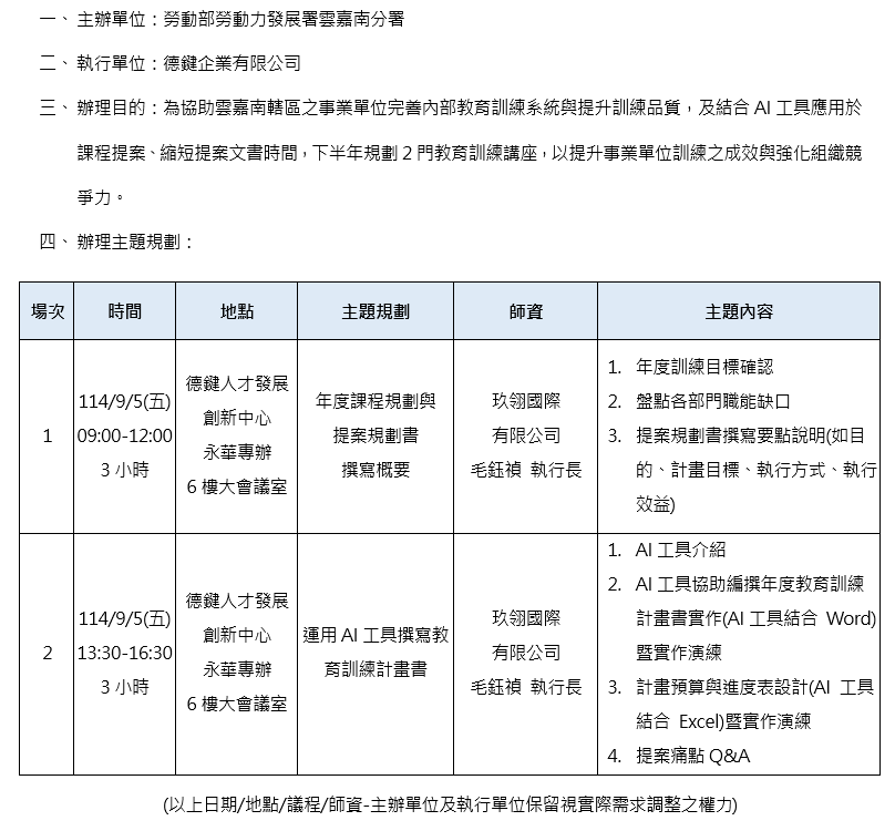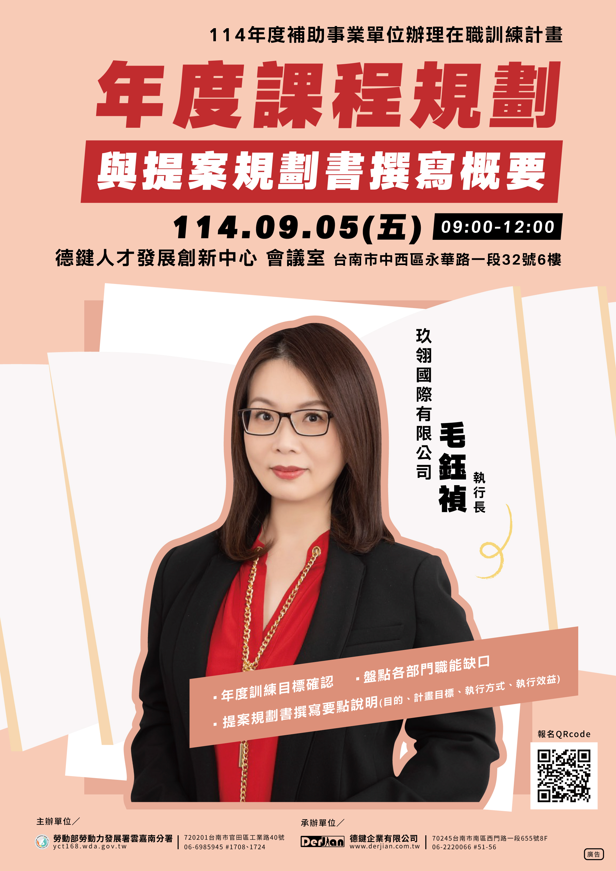 114年度補助事業單辦理在職訓練計畫 教育訓練專題講座 【年度課程規劃與提案規劃書撰寫概要】114/9/5(五) 09:00-12:00 【運用AI工具撰寫教育訓練計畫書】114/9/5(五) 13:30-16:30 線上報名系統網址:連結報名(請點我) 報名聯絡窗口:06-2220066 #51 郭小姐 即日起受理報名,本計畫活動名額有限(額滿即停止受理報名),敬請即刻報名。 以上日期/地點/議程-主辦單位及執行單位保留視實際需求調整之權利。 此屬政府計畫,故執行過程中不會向事業單位收取任何費用。 ※ 報名送出後請來電確認是否報名成功,以確保您的權益。 |
