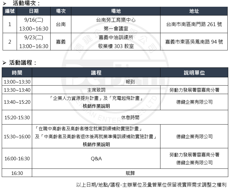 勞動部勞動力發展署雲嘉南分署 114年度補助事業單位辦理在職訓練計畫 結案核銷說明會 為使事業單位瞭解相關計畫之核銷作業及流程,勞動部勞動力發展署雲嘉南分署規劃2場次結案核銷說明會,針對請款方式及核銷注意事項將有詳盡解說,歡迎各事業單位踴躍報名參加,讓您在核銷作業上更得心應手!