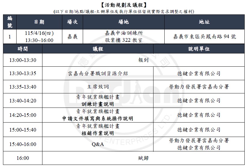 115年度青年就業旗艦計畫輔導說明會 勞動部勞動力發展署為結合產業資源,提升事業單位僱用青年之意願,提供青年務實致用之職業訓練,訂定「青年就業旗艦計畫」。 勞動部勞動力發展署雲嘉南分署特辦理計畫說明會,針對115年度「青年就業旗艦計畫」內容、申請及核銷流程進行說明,歡迎踴躍報名參加! u主辦單位:勞動部勞動力發展署雲嘉南分署 u彙管單位:德鍵企業有限公司 u報名方式 本活動不收任何費用!即日起受理報名,名額有限(額滿即停止受理報名),敬請即刻報名。