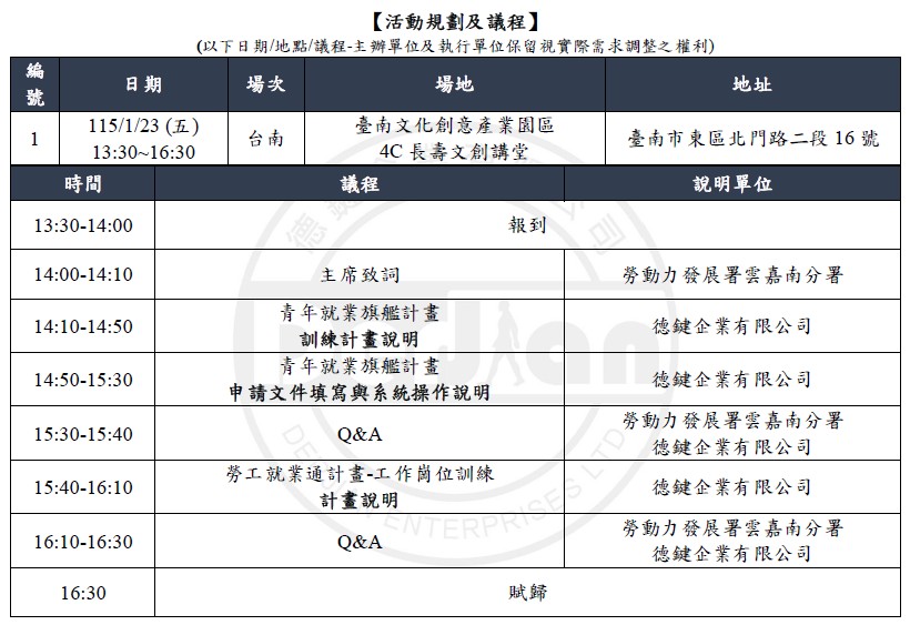 勞動部勞動力發展署為結合產業資源,提升事業單位僱用青年之意願,提供青年務實致用之職業訓練,訂定「青年就業旗艦計畫」。另勞動部為鼓勵雇主聘僱受國際情勢影響產業之失業勞工,提供客製化包裹式服務,以協助失業勞工儘早再就業或轉業,訂定「勞工就業通計畫」。 勞動部勞動力發展署雲嘉南分署特辦理計畫說明會,針對115年度「青年就業旗艦計畫」及「勞工就業通計畫-工作崗位訓練」內容進行說明,歡迎踴躍報名參加! u主辦單位:勞動部勞動力發展署雲嘉南分署 u彙管單位:德鍵企業有限公司 u報名方式 本活動不收任何費用!即日起受理報名,名額有限(額滿即停止受理報名),敬請即刻報名。