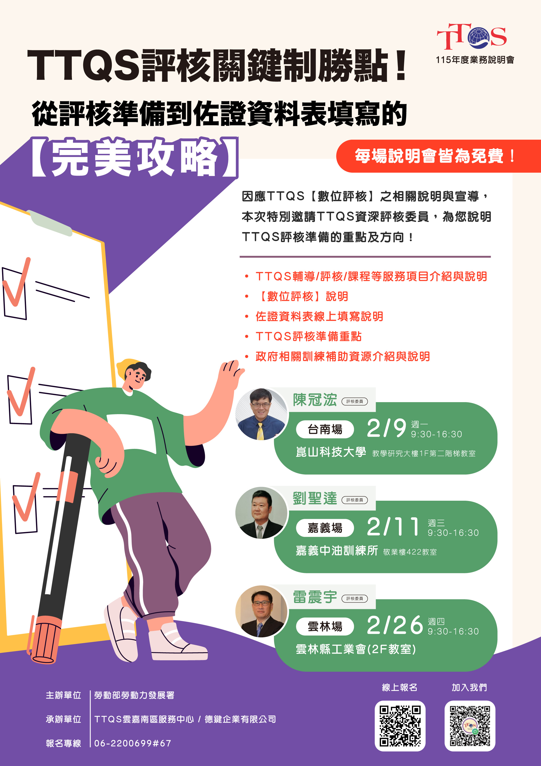 因應TTQS"數位評核"之相關說明與宣導, 本次特別邀請TTQS資深評核委員,為您說明TTQS評核準備的重點及方向! ▣ TTQS輔導/評核/課程等服務項目介紹與說明 ▣【數位評核】說明 ▣ 佐證資料表線上填寫說明 ▣ TTQS評核準備重點 ▣ 政府相關訓練補助資源介紹與說明 報名連結: https://ttqs.wda.gov.tw/ttqs/menu_005_01.php 【台南場】 日期:2025.2.9 (一) 講師:陳冠浤|評核委員 地點:崑山科技大學 【嘉義場】 日期:2025.2.11 (三) 講師:劉聖達|評核委員 地點:嘉義中油訓練所 【雲林場】 日期:2025.2.26 (四) 講師:雷震宇|評核委員 地點:雲林縣工業會 -------------------------------------------------------------------------------- 活動皆為免費入場✨ 名額有限,報名要快! 報名完成後,請來電本中心確認是否成功唷! |