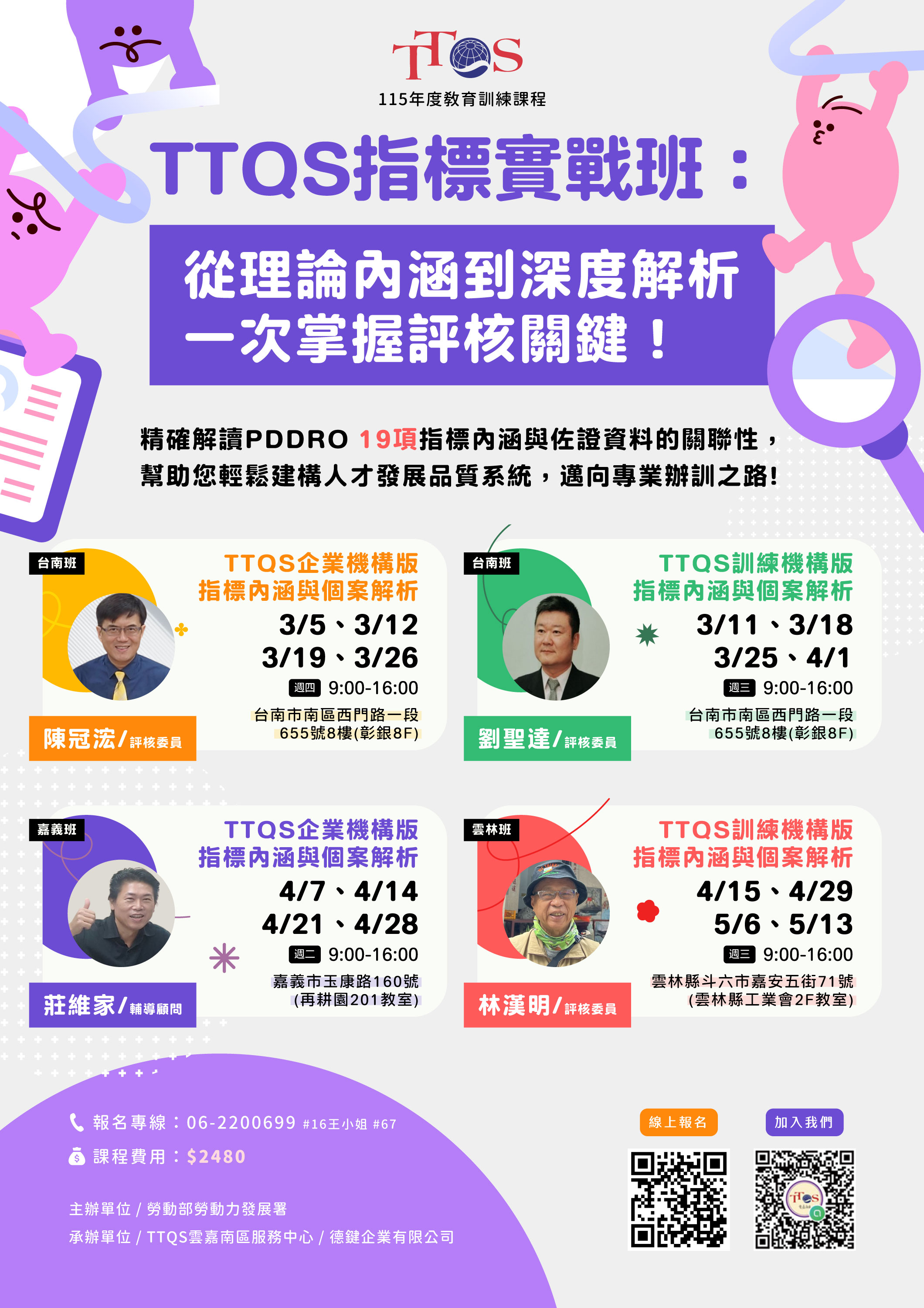 精確解讀PDDRO 19項指標內涵與佐證資料的關鍵性, 幫助您輕鬆建構人才發展品質系統,邁向專業辦訓之路! 【TTQS企業機構版指標內涵與個案解析】 日期:3/5、3/12、3/19、3/26 (週四 9:00~16:00) 講師:陳冠浤/評核委員 地點:台南市南區西門路一段655號8樓(彰銀8F) 【TTQS訓練機構版指標內涵與個案解析】 日期:3/11、3/18、3/25、4/1 (週三 9:00~16:00) 講師:劉聖達/評核委員 地點:台南市南區西門路一段655號8樓(彰銀8F) 【TTQS企業機構版指標內涵與個案解析】 日期:4/7、4/14、4/21、4/28 (週二 9:00~16:00) 講師:莊維家/輔導顧問 地點:嘉義市玉康路160號(嘉義市再耕園201教室) 【TTQS訓練機構版指標內涵與個案解析】 日期:4/15、4/29、5/6、5/13 (週三 9:00~16:00) 講師:林漢明/評核委員 地點:雲林縣斗六市嘉安五街71號(雲林縣工業會2F) |