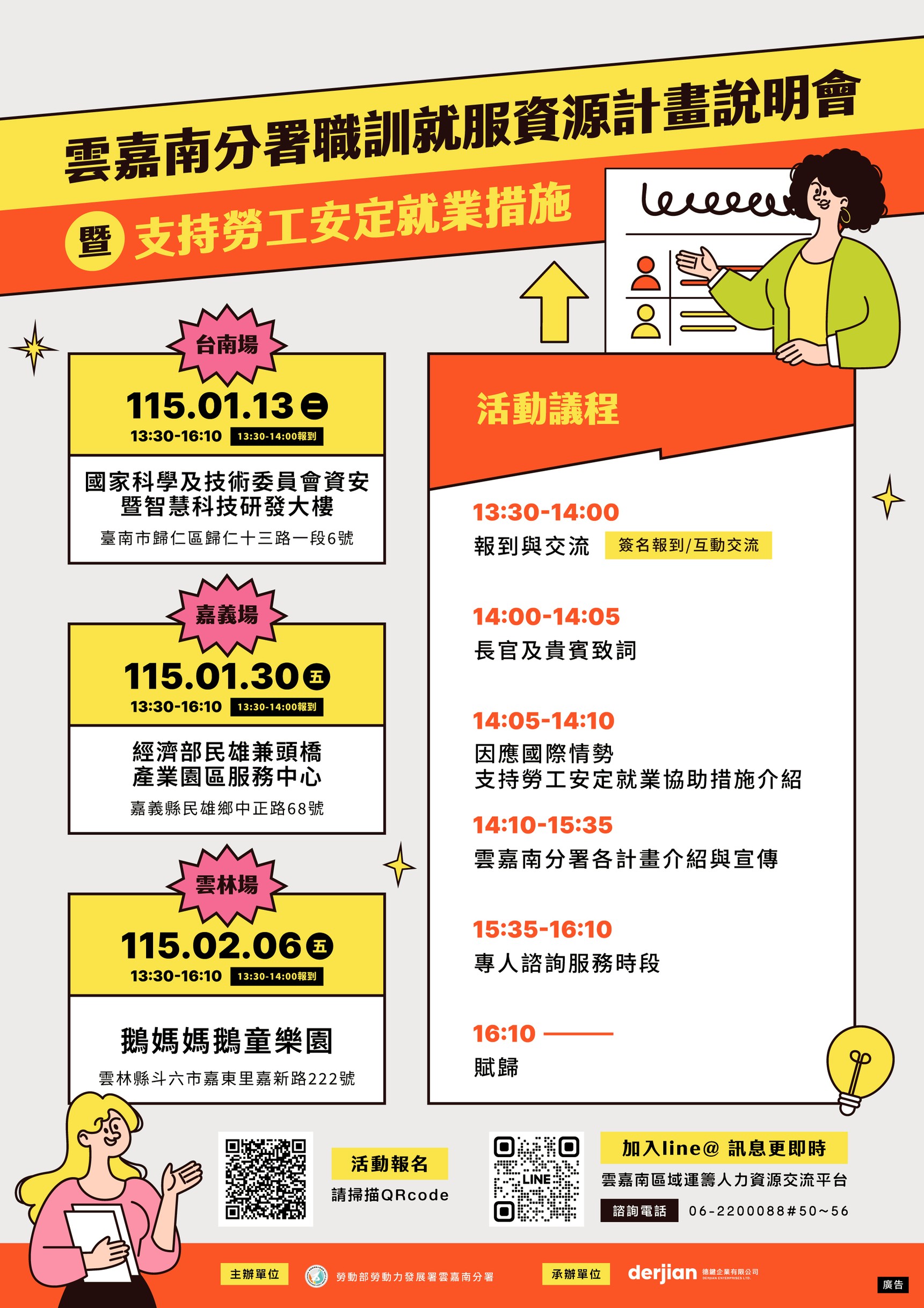 115年度雲嘉南區域運籌人力資源整合服務計畫 雲嘉南分署職訓就服資源計畫說明會暨支持勞工安定就業措施 雲嘉南分署將針對職業訓練、就業服務及國際情勢變動對產業與勞動市場的衝擊,整合勞動部所推動之支持措施,辦理「聯合計畫說明會」。透過各計畫說明,並提供現場一對一專人諮詢服務,使轄區夥伴更加熟知分署資源,協助解決勞動力發展問題。 - 主辦單位:勞動部勞動力發展署雲嘉南分署