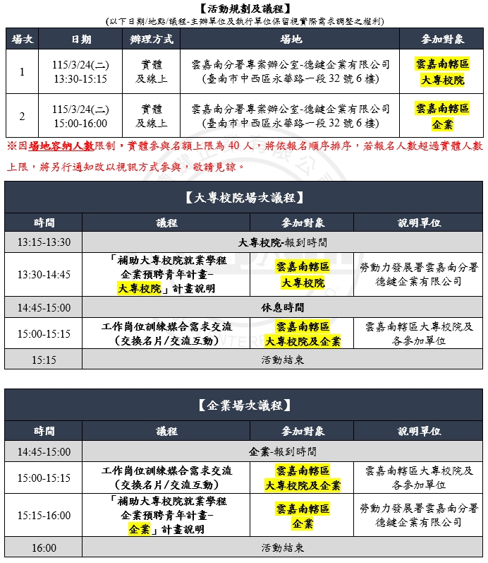 勞動部勞動力發展署雲嘉南分署 115學年度補助大專校院辦理就業學程計畫 暨大專青年預聘計畫推動說明會 勞動部勞動力發展署為提升大專生之就業知識、技能、態度,補助大專校院結合企業辦理就業導向之訓練課程及工作崗位訓練,鼓勵企業聘僱即將畢業之學生進行工作崗位訓練,以利於畢業順利接軌職場就業。為讓大專校院及企業於計畫執行時能更加順利,經蒐集多方意見,將原計畫「補助大專校院辦理就業學程計畫」及「大專青年預聘計畫」進行整併,修訂為「補助大專校院就業學程企業預聘青年計畫」。 本計畫已於115年3月13日公告並同步開放受理申請,115學年度訓練計畫受理期間自115年3月13日至115年4月30日止,為協助大專校院及企業瞭解計畫整併重點及計畫內容,勞動部勞動力發展署雲嘉南分署特規劃辦理「計畫推動說明會」,而因大專校院及企業之申請條件及規範不同,依照申請對象身份別分為兩場次辦理,誠摯邀請各大專校院及企業踴躍報名,共同攜手培育產業人才! u 主辦單位:勞動部勞動力發展署雲嘉南分署 u 彙管單位:德鍵企業有限公司 u 報名方式及注意事項