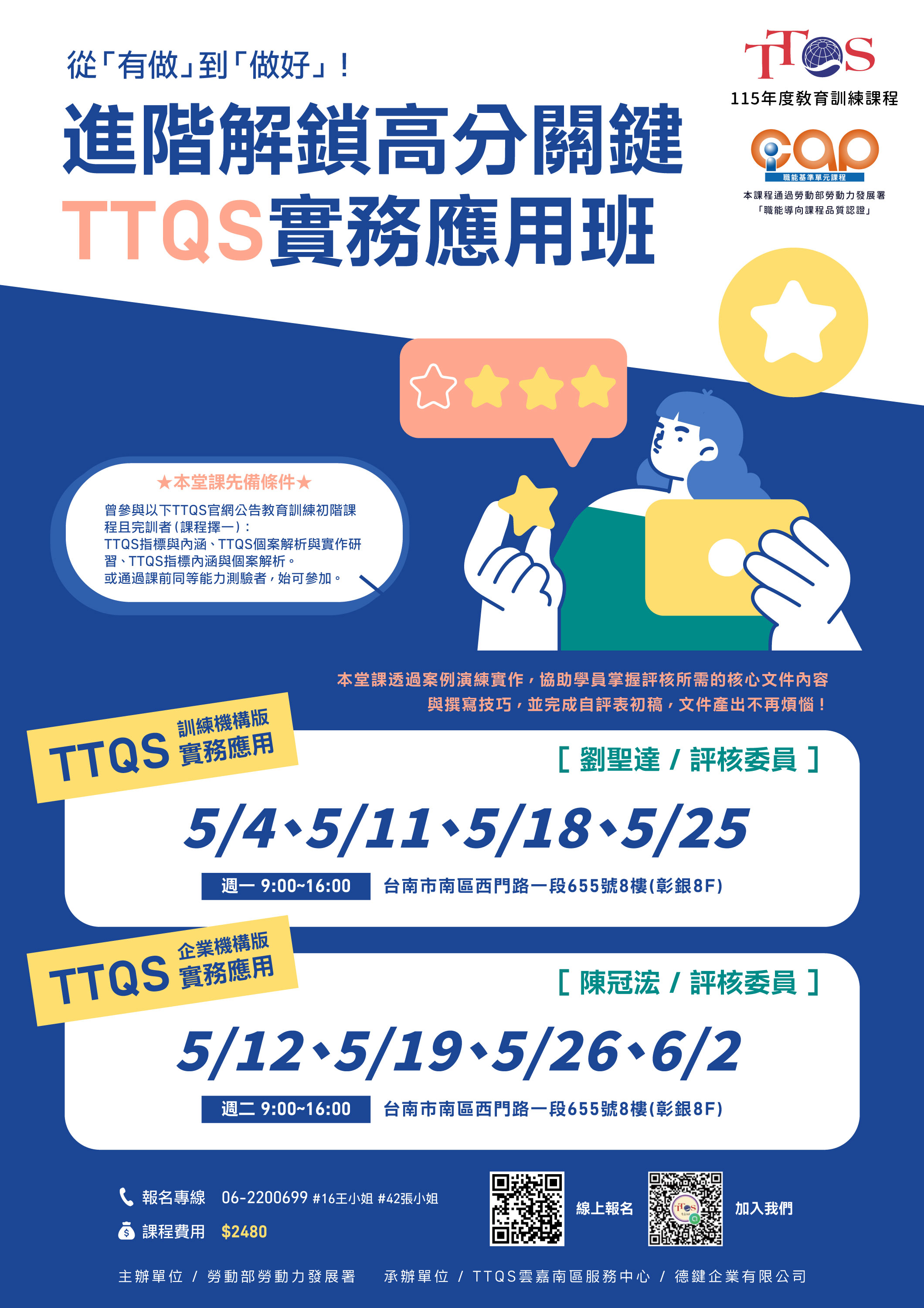 每班課程費用僅2,480元。名額有限,歡迎踴躍報名! 報名連結:https://ttqs.wda.gov.tw/ 區別請選擇”雲嘉南區” _____________________________ 從「有做」到「做好」 !進階解鎖高分關鍵!