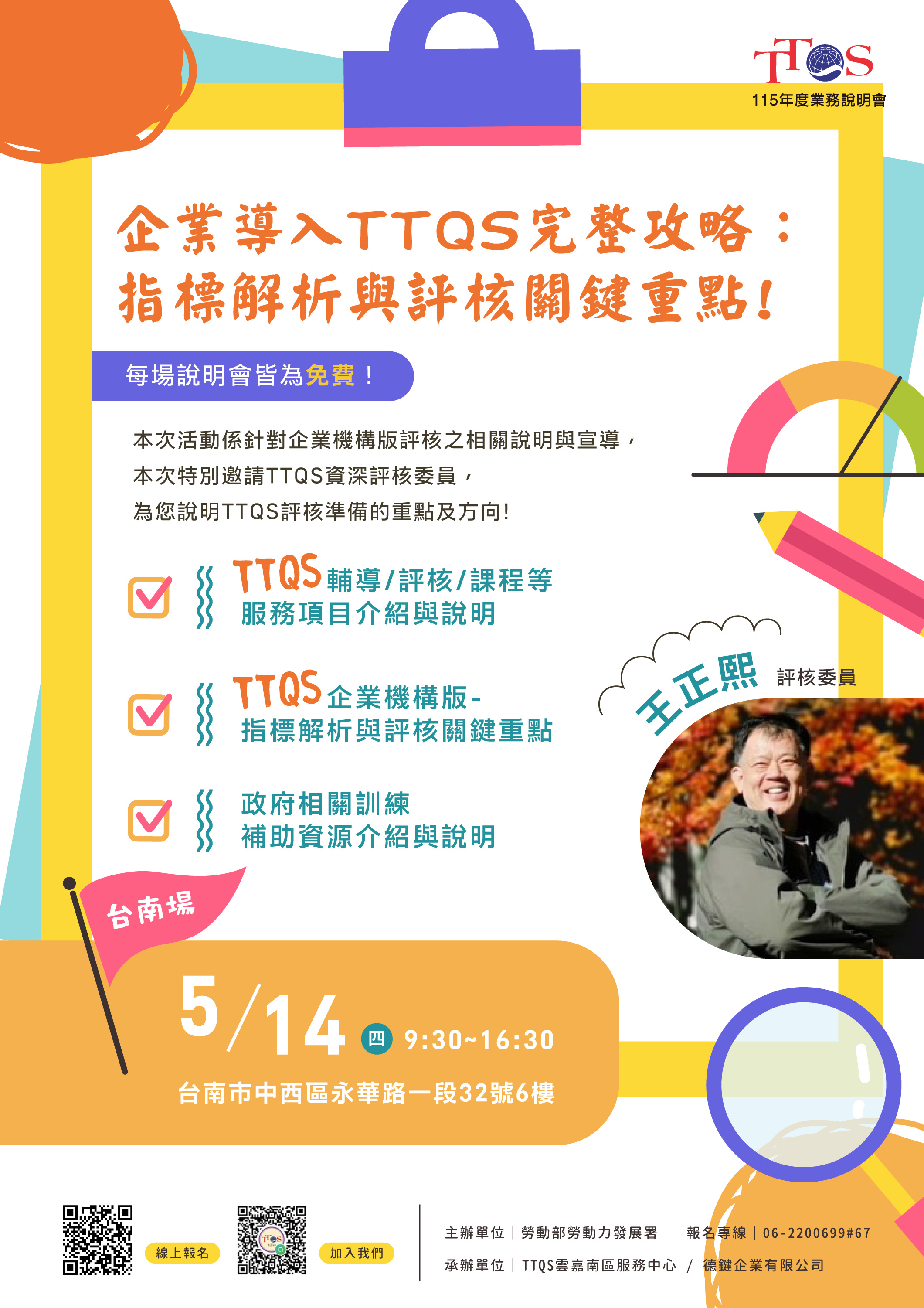 【台南場】 日期:2026.5.14 (四) 講師:王正熙|評核委員 地點:台南市中西區永華路一段32號6樓